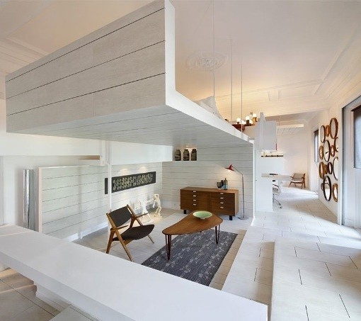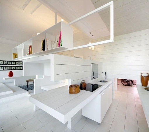 西班牙建築設計公司 Héctor Ruiz-Velázquez 改裝了這棟位於馬德里,建於 20 世紀早期古老建築的閣樓,將它轉變成為一間具有多層次及多隔間的美麗白色住宅,極簡又時尚。房子的內裝大量採用陶瓷裝潢,建立出一種新的生活理念。利用不同的層次設計,房子內部擁有不同水平及方向的樓中樓層,這些不同的空間變成了不同功能的房間,房間與房間流暢連結,提供了靈活的空間變換功能。 根據建築師的目標,轉化陶瓷本身成為一個出色的動態實體,在三個方面提供 “變革與延續”、“傳統與創新”,展現了使用陶瓷材料的一個新角度。